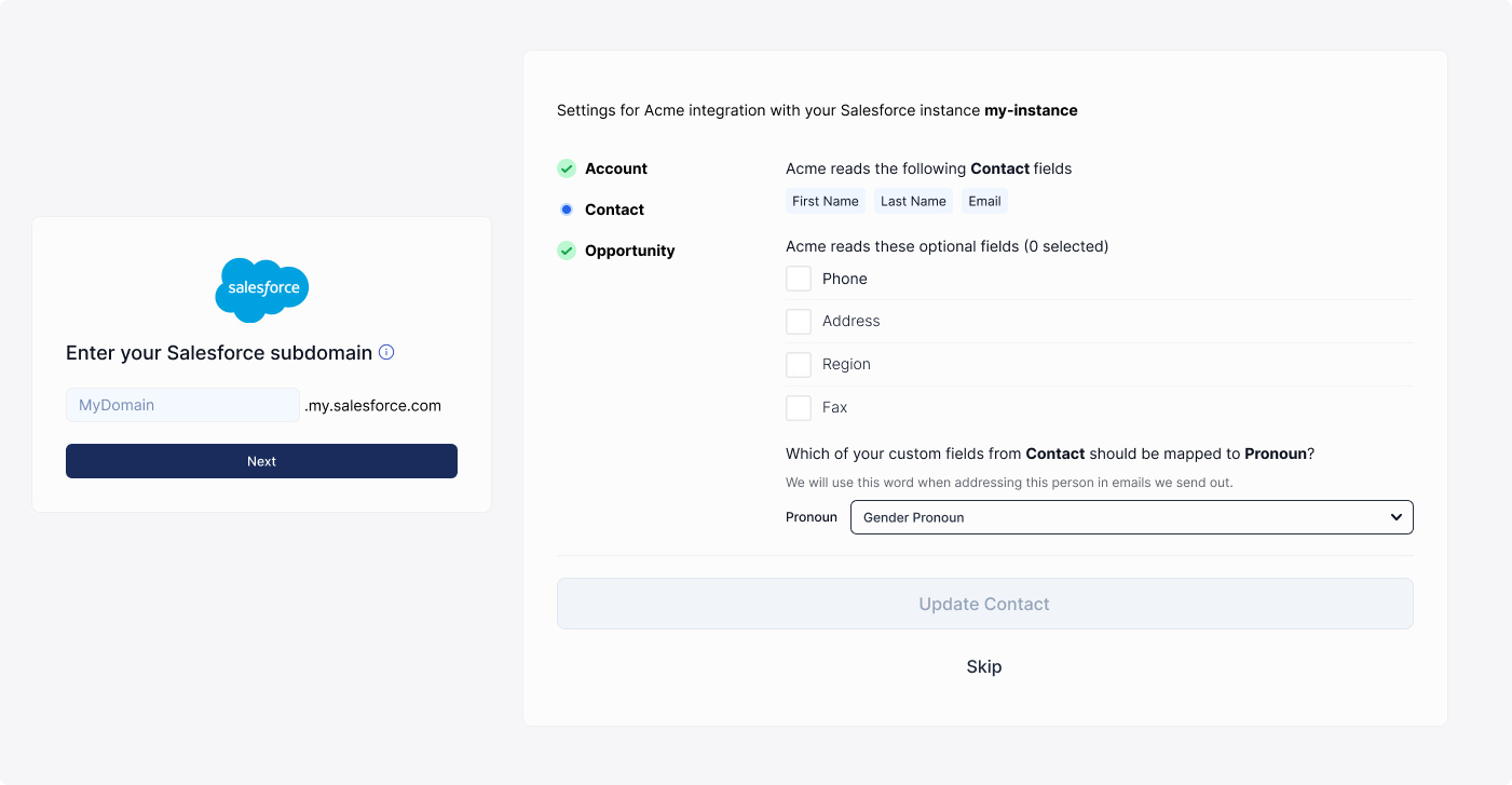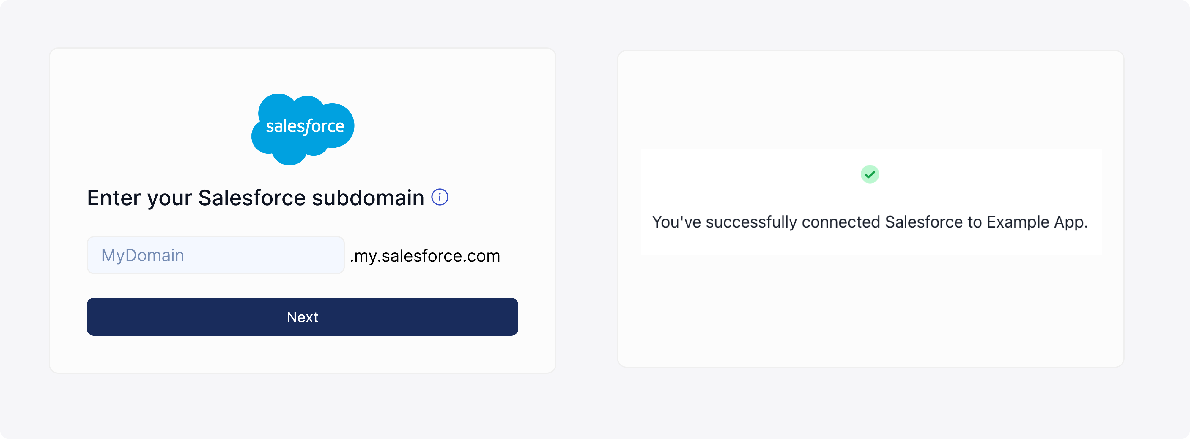 TheInstallIntegration component prompts your customer for their SaaS credentials, and then guides them through the installation flow for an integration. If they’ve already installed this integration, then the component will display the current configuration of the integration and allow them to update it.